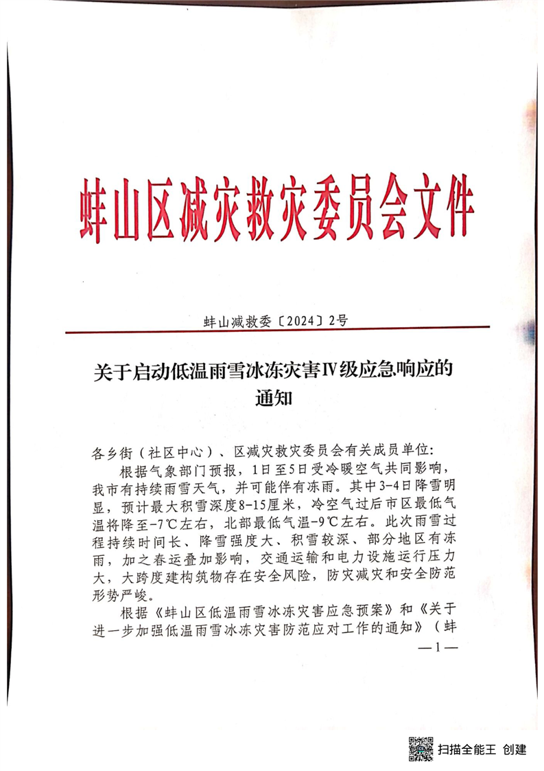 【主动回应】蚌山区减灾救灾委员会关于启动低温雨雪冰冻灾害Ⅳ级应急响应的通知