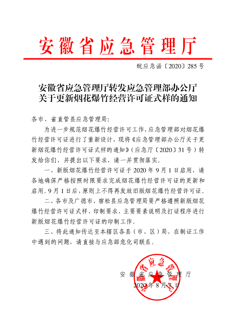 安徽省应急管理厅转发应急管理部办公厅关于更新烟花爆竹经营许可证式样的通知